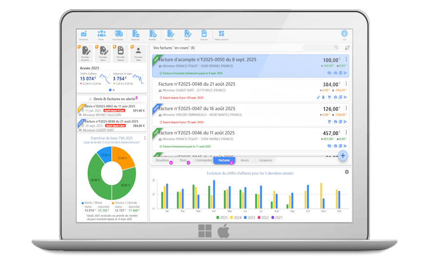 Par sa simplicité d’utilisation, MicroCA Gestion est la solution idéale pour la comptabilité et la facturation des créateurs d’entreprises individuelles ayant opté pour le régime de la micro-entreprise (anciennement appelés “auto-entreprise”) en franchise en base de TVA quel que soit leur activité (ventes, services, services à la personne et/ou libérale). Logiciel disponible pour Windows et macOS.